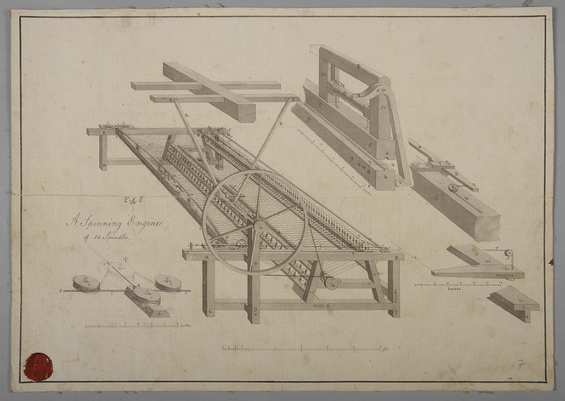 Plán spřádacího stroje s osmdesáti cívkami, který roku 1801 přivezl z Anglie Hugo Franz Salm-Reifferscheidt. Foto © Státní zámek v Rájci nad Svitavou