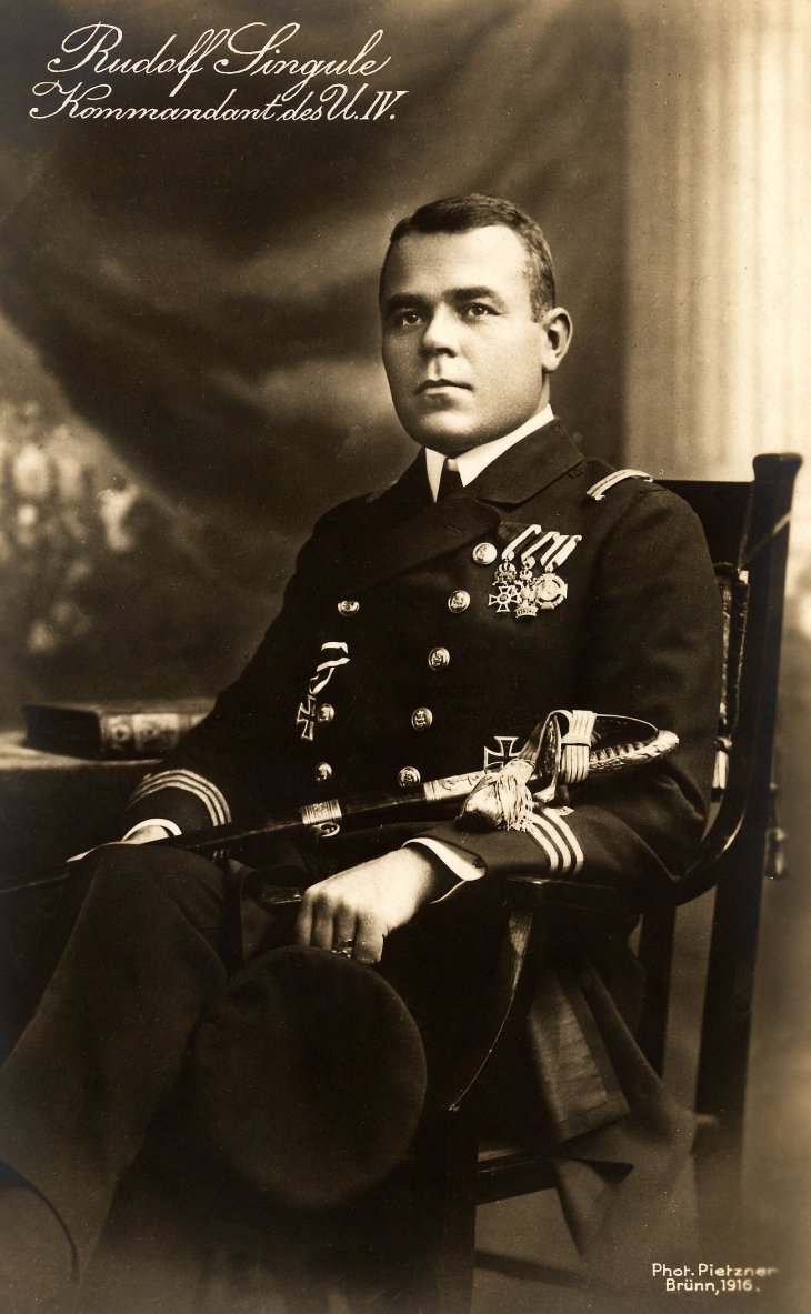 Poručík Rudolf von Singule se narodil 8. 4. 1883 v Pule. Vojenská kariéra mu byla předurčena už tím, že jeho otec pocházející z Brna byl komisařem námořnictva. Roku 1901 vystudoval Námořní akademii v Rijece, poté následovala služba na lodích a torpédovcích. K ponorkám, které mu přinesly největší slávu, se dostal roku 1909, kdy prodělal ponorkový výcvik na nově zařazené ponorce U-4. Jejím velitelem se stal 9. 4. 1915. První úspěchy na sebe nenechali dlouho čekat. Již 9. 6. 1915 jeho ponorka těžce poškodila britský křižník Dublin. Největšího válečného úspěchu, za který byl i vyznamenán, se dočkal nedlouho poté. Dne 18. 7. 1915 dosáhl potopení italského vlajkového křižníku Giuseppe Garibaldi. Do konce války pak potopil ještě dalších 15 lodí. Rudolf von Singule byl známý pro svůj skvělý charakter. Důkazem může být např. fakt, že posádky lodí nechal vždy nastoupit do záchranných člunů. Roku 1918 byl jako instruktor převelen na ponorkovou základnu v Pule. Dále s ním bylo počítáno jako s velitelem zaoceánské ponorky. Konec války mu však přichystal jiný osud, a to návrat do Brna a práci úředníka v penzijní pojišťovně. V armádě však alespoň částečně zůstal, v čs. armádě byl zařazen jako záložní důstojník ženijního vojska. Okupace německými nacisty však opět změnila jeho plány. Kvůli své židovské manželce a dětem se přihlásil do německého námořnictva, kde v letech 1940-1943 sloužil v hodnosti korvetního kapitána jako velitel školní ponorky UD-4 v Kielu a později v Itálii. Svou manželku Doru však ochránit nedokázal. Perzekuce německými úřady ji v prosinci 1940 dohnala k sebevraždě. Tragický osud úspěšného velitele ponorek Rudolfa von Singuleho skončil 2. 5. 1945 v Brně. Když bránil svoji druhou ženu a dcery před rabujícími sovětskými vojáky, jeden z nich ho zastřelil. Za své vojenské úspěchy získal šlechtický titul i řadu vyznamenání, např. německý Železný kříž první třídy nebo vojenský řád Marie Terezie.